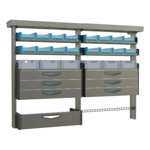 Enthält: 2x Außenprofil. 1x Klappenfachx100. 6x Eurobox klein. 4x Regalbodenx41 abgesenktx100. 6x Schubkastenx100. 8x Box-40-N. 8x Box-30-N. 2x Regalbodenx31 abgesenktx100. 1x Leitergummix100. 1x Mittelprofil. 1x Langgutwanne. 3x Langgutwannenhalterung. 3x Befestigungsset.