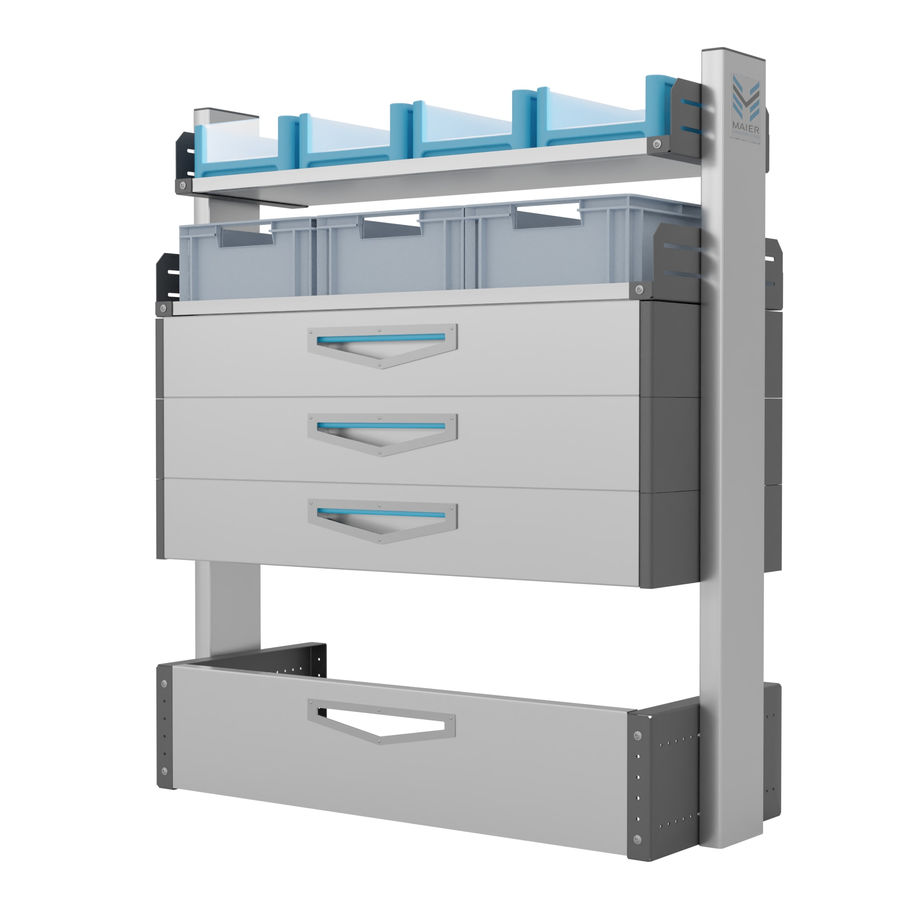 Enthält: 2x Außenprofil. 1x Klappenfachx100. 4x Box-30. 1x Regalbodenx31 abgesenktx100. 3x Schubkastenx100. 3x Eurobox klein. 1x Regalbodenx41 abgesenktx100. 2x Befestigungsset.