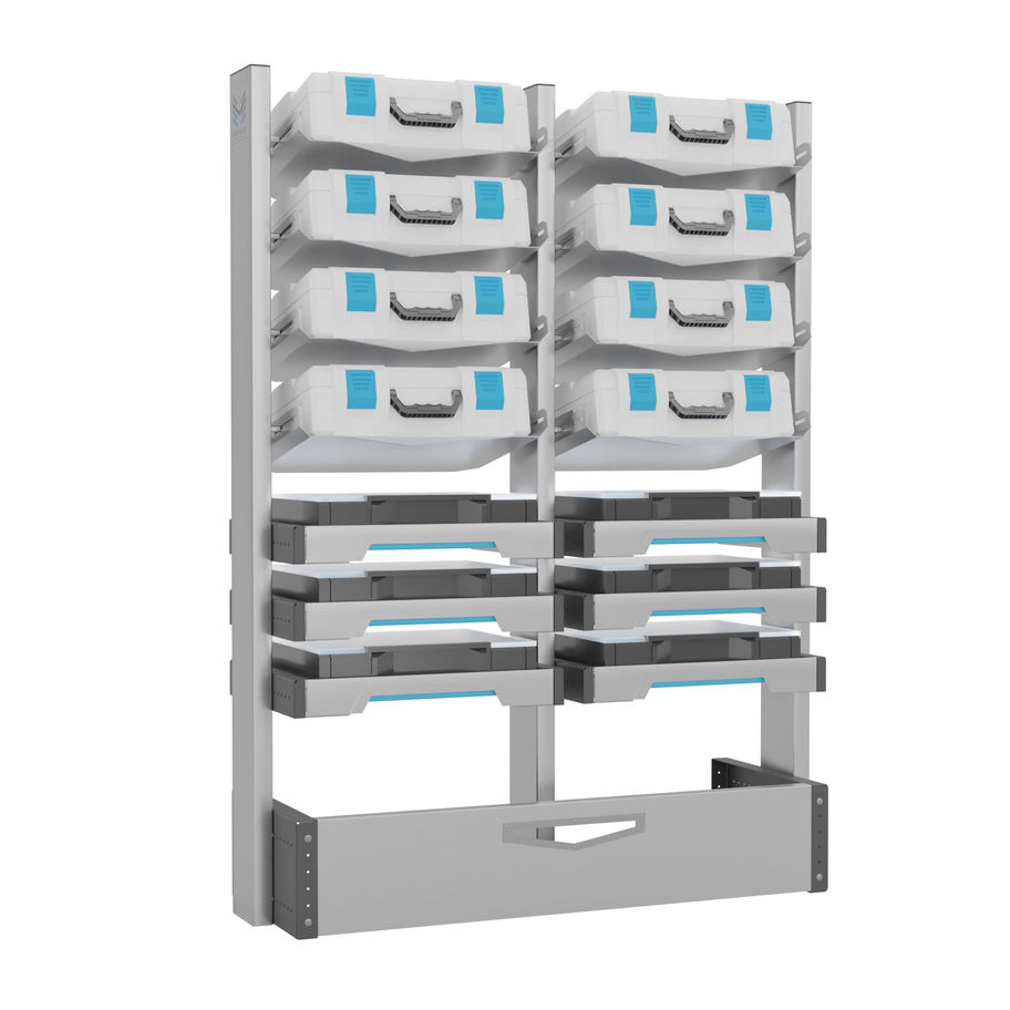 Die Regalserie MASTER sticht hervor durch ihr ausgeklügeltes Design, dass eine hohe Stabilität bei sehr geringem Gewicht ermöglicht. Für die MASTER Serie ist eine Vielzahl an verschiedensten Modulen erhältlich. Das System ist damit für jedes Gewerk und jeden Einsatz bestens geeignet. durch die intelligenten Langlöcher an den einzelnen Regalelementen ist es Ihnen möglich die einzelnen Komponenten wie den Regalböden, Den Schubkästen oder den Kofferauszügen nicht nur in der Höhe einzustellen. Es lassen sich die Elemente dabei auch nach Belieben stufenlos in der Tiefe verschieben. Damit ist es Möglich die Regalsysteme der Fahrzeugeinrichtung an jede Karosserie anzupassen damit der Innenraum im Transporter optimal genutzt werden kann. Darüber hinaus lässt sich ein Großteil der einzelnen Elemente nach oben und unten neigen, was eine komfortable Einlage und Entnahme von Transportgut und Werkzeug ermöglicht.